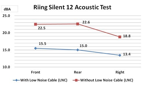 For acoustic test, Riing Silent 12 was tested in a semi-anechoic chamber which includes anti-vibration, sound-proof, and sound-absorbing effect. With a LNC (Low-Noise Cable), Riing Silent 12 can reduce the noise level by 29% from 18.8 dBA to 13.4 dBA, and 50% of fan speed.