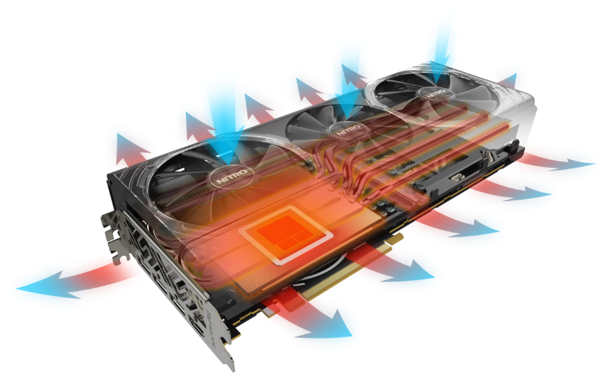 A custom-designed cooling solution used on two new NITRO+ RX Vega cards is SAPPHIRE’s most efficient cooler to date. To get the operational temperatures of the GPUs down to the targeted 70°C, SAPPHIRE has brought back its innovative vapor chamber technology made famous through SAPPHIRE’s Vapor-X series of graphics cards.